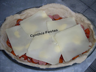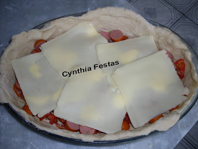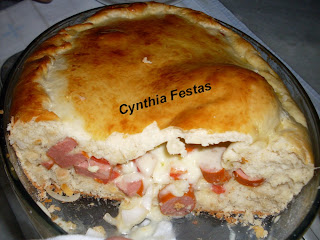 Dissolva o fermento com o açúcar. Acrescente o leite morno e os demais ingredientes. Coloque como último ingrediente o sal pois se colocar no início (junto ao fermento) ele bloqueia o crescimento da massa. Coloque o sal após ter colocado pelo menos 3 xícaras de farinha de trigo. Deixe descansar por 40 minutos. Abra metade da massa em um pirex ou tabuleiro coloque o recheio e abra o restante para tampar. Você tanto pode rechear com cachorro quente como pode rechear com presunto, queijo, cebola e molho de tomate.